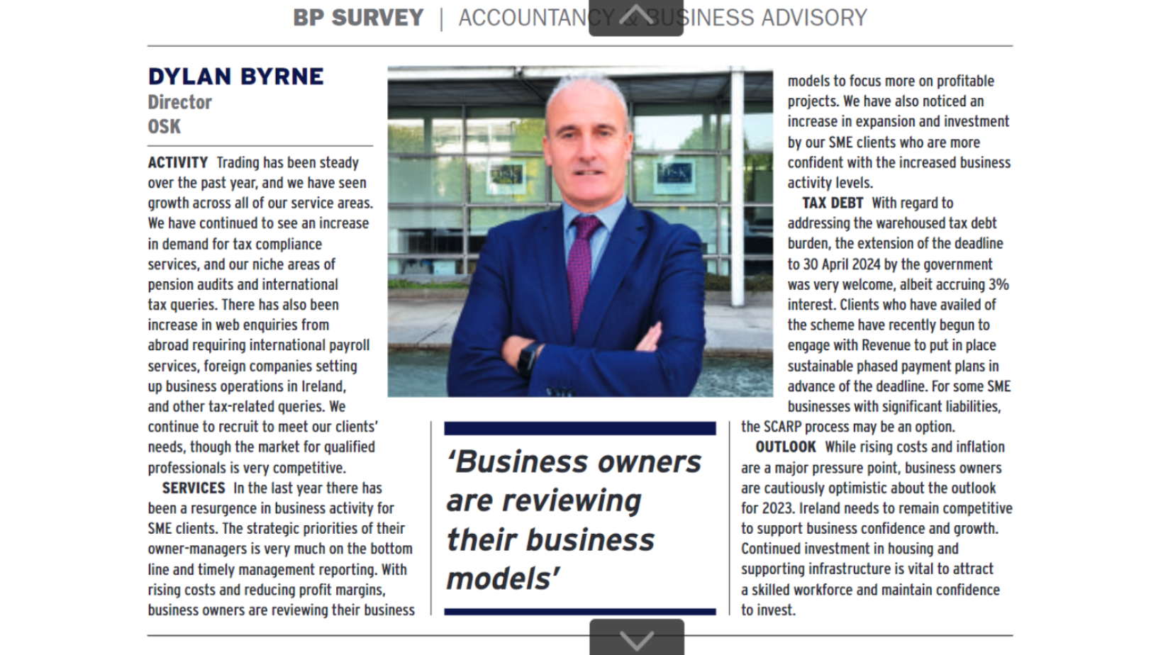 Dylan Byrne, along with partners in Irelands’ top Accountancy Firms shared his views on the challenges facing business owners, business confidence, government supports and the strategic priorities of owner-managers.